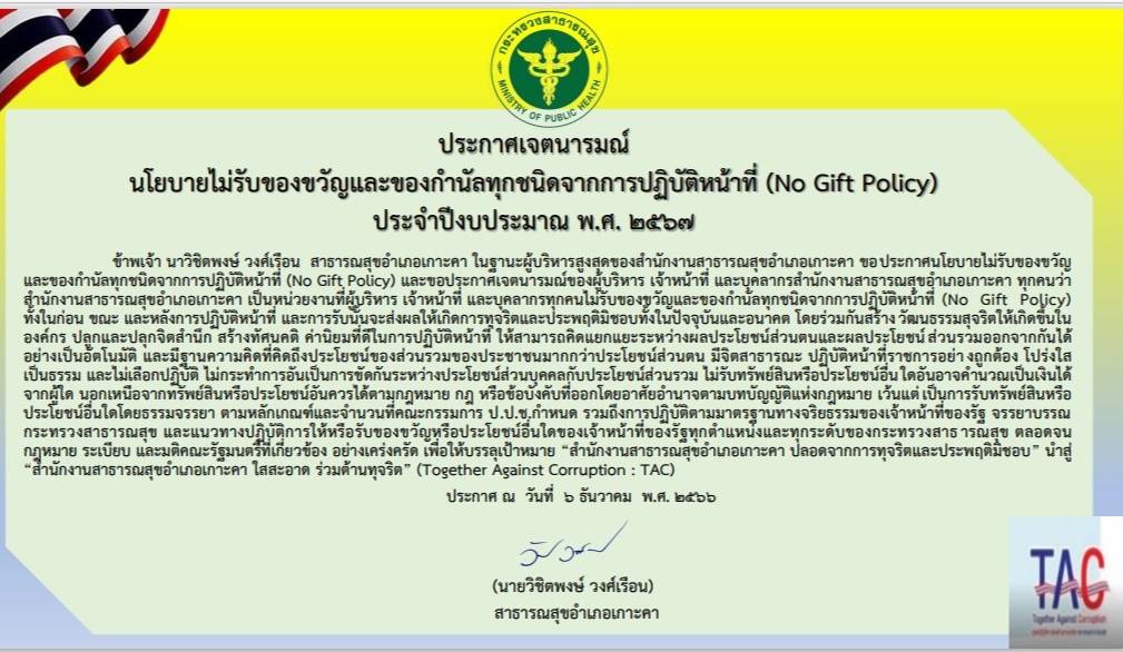 Posted on 07/12/2023Posted in ข่าวประชาสัมพันธ์ ประกาศเจตนารมณ์นโยบายไม่รับของขวัญและของกำนัลทุกชนิดจากการปฏิบัติหน้าที่ (No Gift Policy) ประจำปีงบประมาณ พ.ศ. 2567 Post navigation ประกาศเจตนารมณ์การต่อต้านการทุจริต“สำนักงานสาธารณสุขอำเภอเกาะคาใสสะอาด ร่วมต้านทุจริต (MOPH Together Against Corruption)”ประจำปีงบประมาณ พ.ศ. 2567ประกาศเจตนารมณ์การป้องกันและแก้ไขปัญหาการแสวงหาประโยชน์ทางเพศ การคุกคามทางเพศและการคุกคามทางเพศในการทำงาน ประจำปีงบประมาณ พ.ศ. 2567 Leave a ReplyYour email address will not be published. Required fields are marked *Comment * Name Email Website